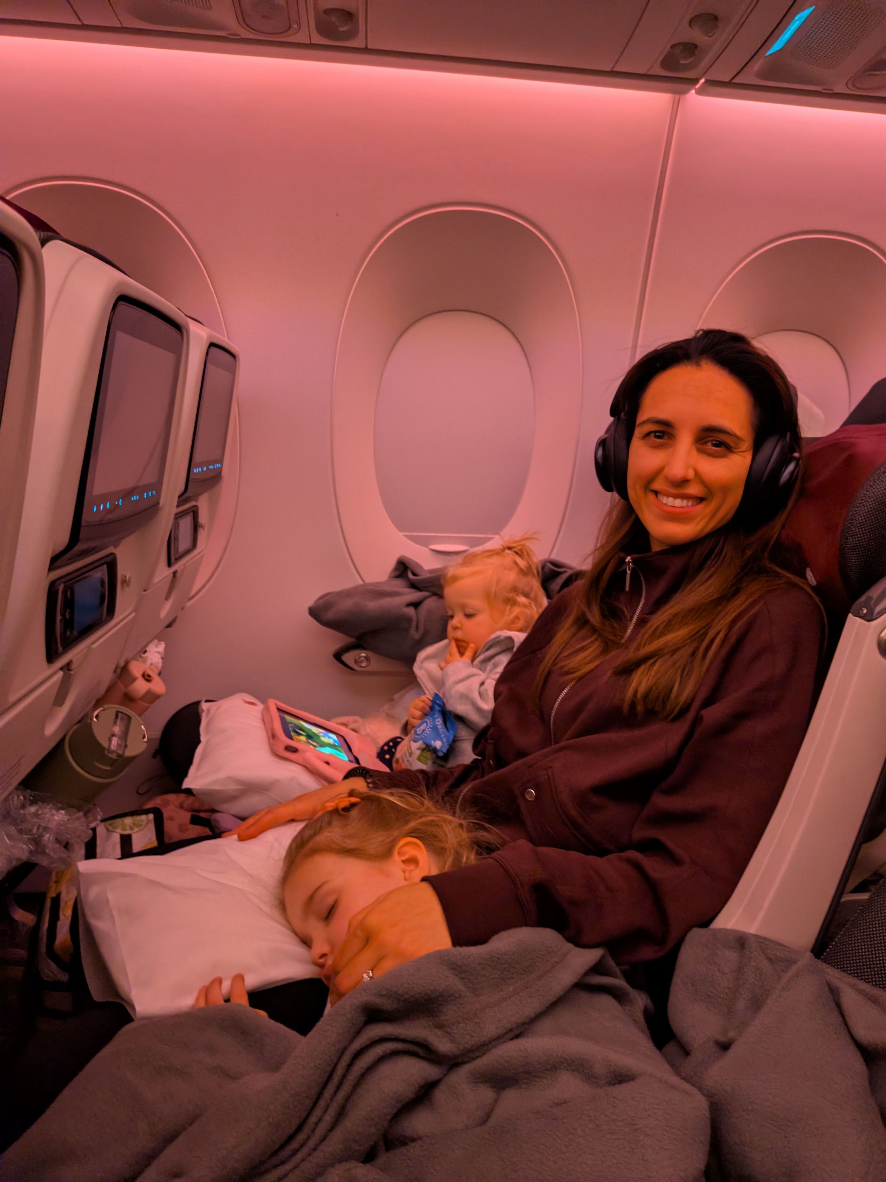 We got lucky on the long leg. Plenty of seats were available across the cabin, and we managed to claim a whole extra row — Ilaria and I set up camp there while Rose and Issy had the main row to themselves. Issy slept for most of the flight. Ilaria was considerably more work, but we eventually got her down too. Fourteen hours is a long time to keep two small children settled at 35,000 feet, and we’ll call it a win.