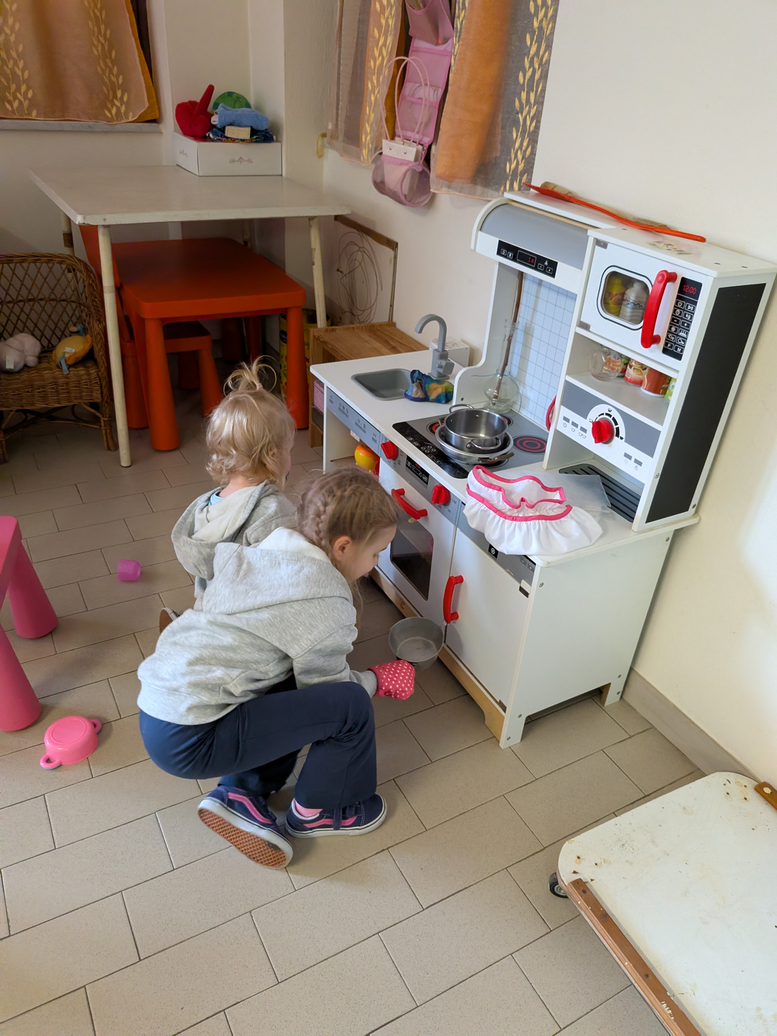 From there, the airport experience went smoothly. Security and passport control were straightforward. Ilaria and Issy entertained themselves by pushing the little suitcases through the terminal, and we boarded the plane to a very welcome surprise: empty rows of seats around us.