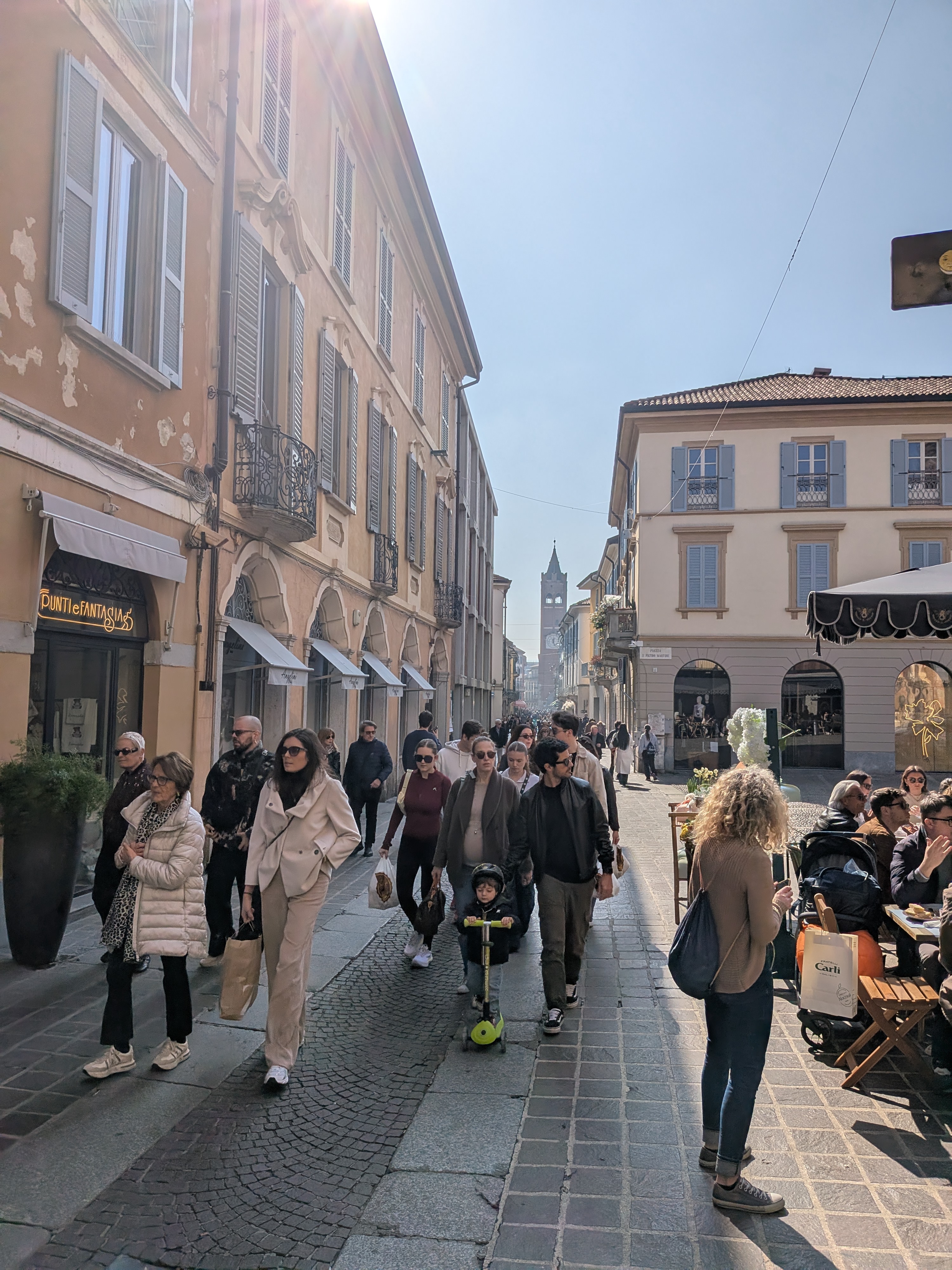 By now it was approaching midday, and Monza had transformed entirely. The same streets I had walked through in near-silence at dawn were now alive. A market had taken over the centro, stalls spilling across the cobblestones, locals drifting between them without any particular urgency.