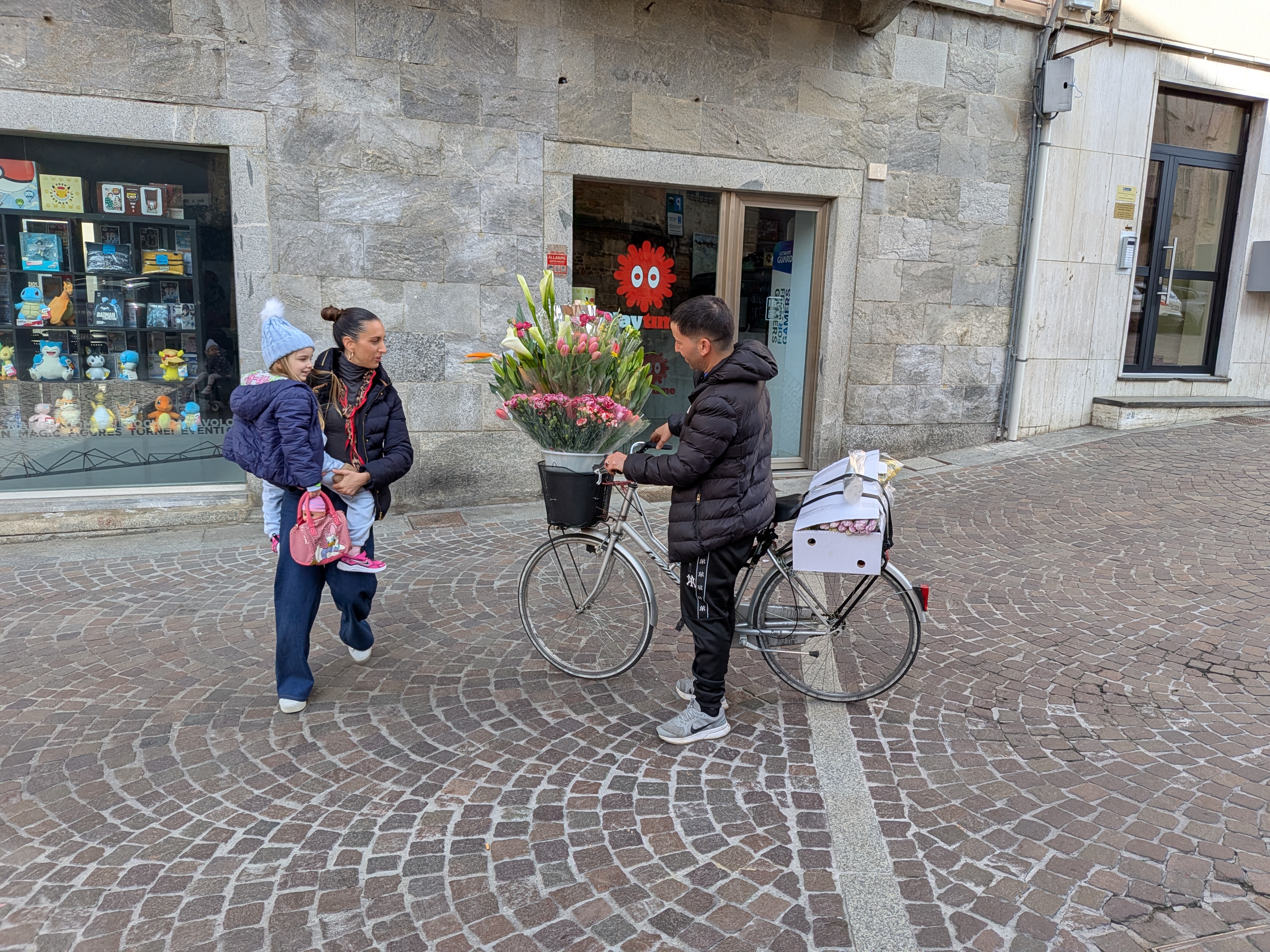 In the morning we explored the local piazza and streets. It was such a nice vibe. Within 5 minutes of walking, we saw a man on a bike selling flowers. Rose just had to buy some! We then went to Qbo, one of the local bars, for a coffee and pastries. Ilaria couldn’t contain her energy inside (which is normal), so I took her outside to run around in the Piazza.